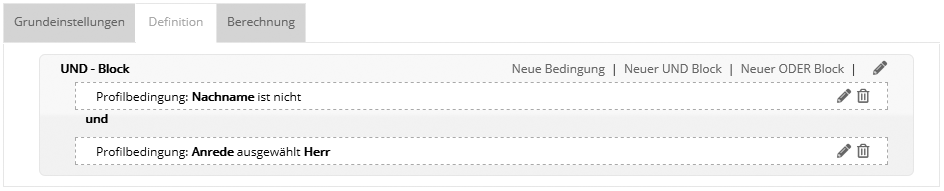 Per Klick auf das kleine Taschenrechner-Symbol berechnen Sie die Abonnenten-Anzahl der Zielgruppe für alle Abonnentenlisten. Mit Klick auf 'Abonnenten' in der Spalte 'Schnell-Links' sehen Sie, welche Abonnenten zur Zielgruppe gehören. Wenn Sie die Berechnung auf bestimmte Abonnentenlisten beschränken möchten, klicken Sie auf das Bearbeiten-Symbol. Auf dem Reiter 'Berechnung' markieren Sie nun gewünschten Abonnentenlisten. Selbstverständlich können Sie auch direkt in der Zielgruppe eine bestimmte Listenzugehörigkeit definieren. Neue Zielgruppe anlegenKlicken Sie oben rechts auf 'Neue Zielgruppe' und geben Sie den Namen und (optional) eine Beschreibung der Zielgruppe ein. Wechseln Sie anschließend zum Reiter 'Definition'. Reiter 'Definition'Hier erstellen Sie die Bedingungen Ihrer Zielgruppe, z. B. Anrede = "Herr". Klicken Sie oben rechts auf 'Neue Bedingung' und wählen Sie einen der folgenden Bedingungstypen: