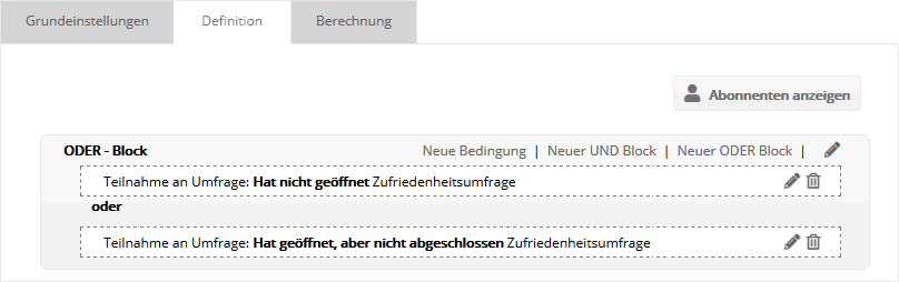 Zur Prüfung der Umfrageteilnahme genügt in der Regel eine einzige Zielgruppenbedingung. Möchten Sie die zuvor angeschriebenen "teilnahmslosen" Abonnenten noch einmal um Umfrageteilnahme bitten, kombinieren Sie zwei Bedingungen per ODER: