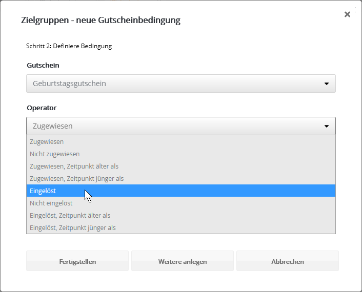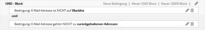 Insbesondere nach dem Kopieren einer vorhandenen Zielgruppe kann das sinnvoll sein, wenn die identischen Abonnenten in Original und Kopie nicht gewünscht sind. Bedingung anhand GutscheinFiltern Sie Abonnenten danach, ob und in welchem Zeitraum die Zuweisung oder Einlösung eines Gutscheins stattfand. Tipp: Um zugewiesene Gutscheine als eingelöst zu markieren, nutzen Sie entweder die Webservice-Funktion 'RedeemVoucherByCode' oder importieren in der Gutscheinübersicht eine CSV-Datei mit den eingelösten Gutscheincodes. Bedingung anhand SelektionMit diesem Bedingungstyp nutzen Sie eine per Webservice angelegte Selektion von Abonnenten als mailator-Zielgruppe. Der Bedingungstyp ist nur dann sichtbar, wenn per Webservice mindestens eine Selektion angelegt wurde. Das Besondere: In einer Selektion werden Abonnenten anhand einer Liste von IDs gruppiert. So lässt sich eine extern getroffene Abonnentenauswahl als Zielgruppe nutzen, ohne dass in den mailator-Abonnentendaten ein gemeinsames Merkmal vorliegen muss. Die Details entnehmen Sie bitte der Webservice-Dokumentation, die wir Ihnen gern zusenden. Bedingung anhand des Empfängers (geplant)Diese Bedingung entscheidet, ob ein Abonnent als Empfänger eines bestimmten Mailings vorgesehen war oder nicht. Das bedeutet, dass er in einer Abonnentenliste bzw. Zielgruppe für ein bestimmtes Mailing steht, welches versandt wurde. Im Unterschied zur letztgenannten Bedingung wird der tatsächliche Empfang jedoch nicht geprüft. Es sind auch alle Empfänger enthalten, die das Mailing z. B. aufgrund von Bounces, Blacklists oder serversseitigen Spamfiltern nicht empfangen haben. Bedingung anhand des Empfangens (zugestellt)Diese Bedingung entscheidet, ob jemand ein bestimmtes Mailing empfangen hat oder nicht. Das Mailing gilt als empfangen, wenn der E-Mail-Server des Abonnenten eine positive Rückmeldung erteilt hat. Im Schritt nach dem Empfang ist es dennoch möglich, dass das Mailing beim Empfänger in einem Spamordner landet. Bedingung anhand des BounceverhaltensDamit legen Sie Bedingungen anhand der Zustellungen oder Nichtzustellungen eines bestimmten Mailings an. Bedingung anhand Blacklist bzw. Zurückgehaltener AdressenAbonnenten, deren E-Mail-Adresse auf einer Blacklist oder der Liste der zurückgehaltenen Adressen steht, werden automatisch vom Versand ausgeschlossen. Dieselben* Abonnenten lassen sich per Zielgruppe filtern, etwa um sie beim Export Ihrer Abonnentendaten ebenfalls auszuschließen. Die kombinierte Zielgruppe sieht wie folgt aus: