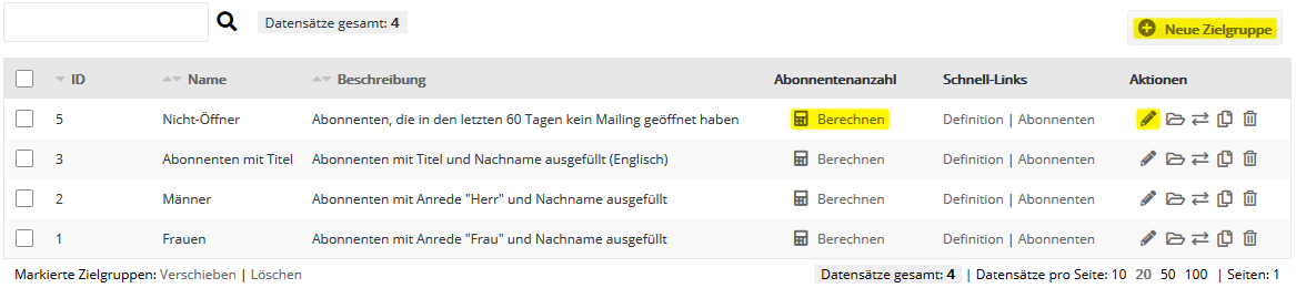 Mit Zielgruppen filtern Sie Ihre Abonnenten nach einer Vielzahl von Merkmalen, wie z. B. Anrede = "Herr" oder "hat im Mailing x den Link y geklickt". Zielgruppen reagieren automatisch auf veränderte Abonnentendaten und sind nicht an starre Abonnentenlisten gebunden. Sie erlauben eine sehr präzise und immer aktuelle Gliederung Ihrer Abonnenten. Zielgruppen lassen sich jederzeit neu definieren, ändern oder löschen. Die Abonnentendaten selbst bleiben davon unberührt. In der Übersicht sehen Sie die vorhandenen Zielgruppen Ihres Accounts. |