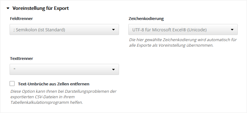 Folgende 'HTML-Editoren' sind in mailator integriert und nutzbar: Grundeinstellung ExportHier legen Sie die Voreinstellung für den Export von CSV-Dateien fest, z. B. für den Export von Abonnentendaten. Bei der Durchführung jedes Exportes können Sie bei Bedarf auch eine abweichende Einstellung wählen. Standardeinstellung ist die Option 'UTF-8 für Microsoft Excel® (Unicode)', technisch gesprochen 'UTF-8 mit BOM'. Dieses Format wird von den meisten Officeanwendungen automatisch erkannt, so dass Umlaute und Sonderzeichen ohne manuelle Formatwahl korrekt importiert werden. StatistikeinstellungenTragen Sie Ihre eigenen Maximalwerte ein, um die rot|gelb|grün Farb-Umschaltung der Statistik-Anzeige für Öffungsrate, Klickrate und Bouncerate an die typischen Werte Ihrer Mailings anzupassen. Nur Ihre besten Mailings sollten den grünen Bereich erreichen. Die Farb-Umschaltung erfolgt automatisch in Drittel-Stufen des eingetragenen Maximalwertes. Empfehlung: Notieren Sie aus der Statistik Ihrer bisherigen Mailings die Durchschnittswerte für Öffnungsrate, Klickrate und Bounces. Damit dieser Durchschnittswert zukünftig im mittleren Drittel der Skala landet, tragen Sie das Doppelte dieses Wertes als Maximum in das jeweilige Feld ein. Tragen Sie z. B. 30% als Maximum ein, dann werden anschließend die Werte bis 10% rot, bis 20% gelb und darüberliegende Werte grün gefärbt. Sie sehen sofort, ob Ihr aktuelles Mailing über- oder unterdurchschnittlich abschneidet. Typische Durchschnittswerte: