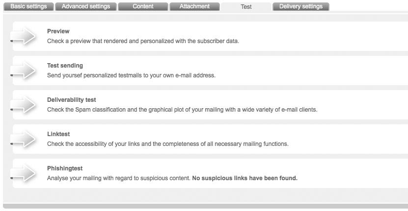Having finished your newsletter, mailator offers you numerous testing possibilities. This helps you to optimize your mailing and achieve maximum success before actual dispatch. You can get to the testing functions by choosing the tab 'Test' in the menu in which you edit your mailing. Following tests are available: |