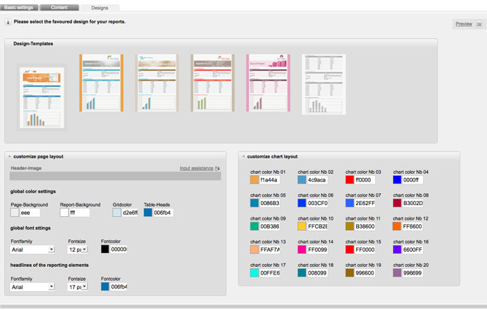 Now you also can adjust the design of your report. Choose the tab 'designs'. By default mailator suggests you six different layouts. HTML experts can also open the 'advanced settings' below the layouts to edit the html-code. For example you can insert your logo in th header.