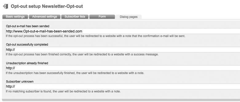 Enter a name and an optional description. Choose the 'mode' (important). The following modes are supported by 'mailator': Double-optout with confirmation e-mail: after unsubscribe from your website or your newsletter a confirmation email will be send automatically. Optout will be activated after clicking the confirmation link in this email. After successful unsubscription the former subscriber will get a last email („You unsubscribed successfully of our newsletter.“) Double Optout: Like described before, but without sending of a „successful unsubscription“ e-mail Confirmed Opt-Out (recommended): After unsubsubscription on your website or in your newsletter a „successful unsubscription“ email will be sended immediately. Single Optout: No e-mails will be send. There just will be a message in your browser, that optout was successfull. In Tab 'advanced settings' you can deposit your e-mail address in field 'e-mail forwarding', to be informed about unsubscriptions. Tab 'subscriberlists': Choose your favorite subscriberlist(s), where all unsubscriptions should be logged out. Select the subscriberfields, which should be filled out by your subscribers in tab 'Form'. After clicking 'create form fields' a popup appears, where you can choose and add subscriber fields to your form. Click 'sort formular fields' to arrange your fields. Click 'test form' to open a new tab in your browser with a preview of your form. Source Code of your website is genereated by 'mailator' by clicking 'Formular soruce code'. A popup appears with your source code. Last tab: Dialog pages |