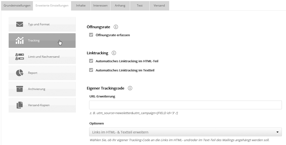 ÖffnungsrateUm nach dem Versand auszuwerten, wieviel Prozent der Empfänger das Mailing geöffnet haben (siehe 'Übersicht, Öffnungs-/Klickrate'), muss die Option 'Öffnungsrate erfassen' aktiviert sein. Dazu integriert mailator im HTML-Teil des Mailings ein unsichtbares Zählpixel, welches für jeden Empfänger individuell verlinkt ist und dessen Aufruf als Öffnung gezählt wird. Die Messung funktioniert unabhängig von der Mailing-Einstellung 'Inboundimages', solange der Empfänger die Anzeige von Bildern in seinem Posteingang nicht unterdrückt. Hinweis: Ist die Erfassung der Öffnungsrate deaktiviert, aber die nachfolgende Option "Linktracking" aktiviert, dann werden Klicks automatisch auch als Öffnung gewertet. Die Öffnungsrate erfasst in dem Fall nur den Teil der Öffner, der irgendeinen Link angeklickt hat. LinktrackingAktivieren Sie Automatisches Linktracking im HTML-Teil, so wird jeder im Mailing enthaltene Link durch einen Tracking-Link ersetzt, der für jeden Abonnenten individualisiert ist. Diese Tracking-Links werden über den mailator-Server auf die ursprüngliche Link-URL umgeleitet und dabei gezählt. Damit können Sie nach Versand des Mailings sehen, wie oft jeder Link angeklickt wurde (siehe 'Übersicht, Öffnungs-/Klickrate'). Weiterhin lassen sich darauf basierend Zielgruppen bilden, z. B. "Alle, die Link B angeklickt haben" können erneut mit weiteren Informationen angeschrieben werden. Bitte beachten Sie, dass Sie jede URL vorher als Link definieren müssen. Sie können die Richtigkeit der Tracking-Links überprüfen, indem Sie sich ein Testmailing zusenden. Eigener Tracking-CodeHier ist es möglich, alle Links des Mailings automatisch um eigene Parameter zu erweitern. Damit lässt sich das weitere Verhalten der Newsletterempfänger per Website-Analyse-Tools wie z.B. Google Analytics, Piwik oder econda tracken. Kopieren Sie dazu den Tracking Code Ihres Tools in das Feld, damit mailator ihn automatisch an alle externen Links Ihres Mailings anhängt. Folgende Parameter werden unterstützt:
