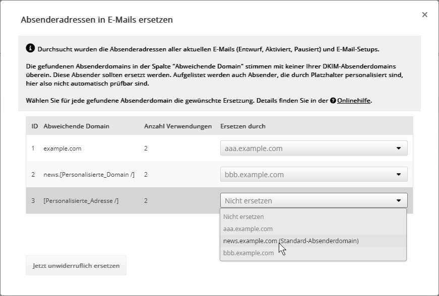 Wählen Sie zu jeder abweichenden Domain die gewünschte Ersetzung. Voreingestellt ist die Option "Nicht ersetzen". Sie haben die Wahl, ob Sie zunächst nur eine Absenderdomain ersetzen oder gleich mehrere.